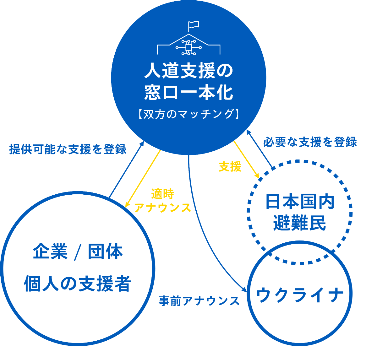 本WEBは、在日ウクライナ大使館と連携し、ウクライナからの避難民と支援したい人を繋ぐ情報プラットフォームです。ウクライナから日本への避難民が必要とする支援と情報を適切に受けとることを目的としています。また、物流支援物資を実施予定です。