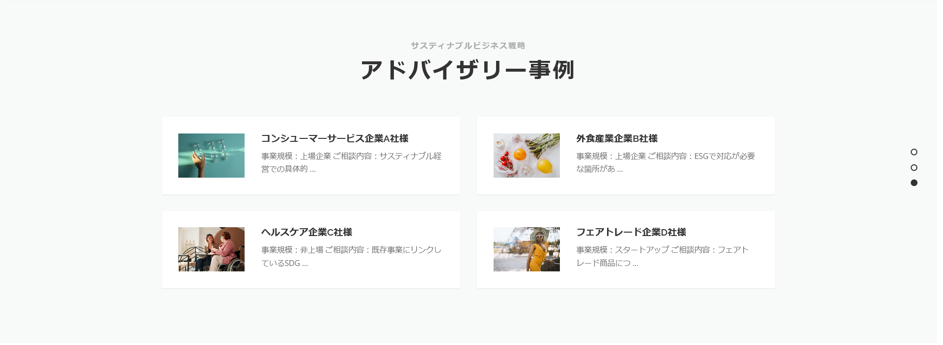 コーポレートガバナンスコードの改定、証券市場の改変により、プライム上場企業ではサスティナブルレポートの開示が必須となっています。また、多くの機関投資家はESGへの取り組みを注視しており、プライム上場企業のみならず、サスティナビリティ戦略を経営に取り入れることが非常に重要となっています。当社のミッションはサスティナビリティの向上をサポートし、次世代の為により良い社会を実現する事であり、創業者が現役のプライム企業社外取締役であることから、企業のサスティナブル戦略に緊密に関わっています。また、日本市場における上場企業役員のうち、サスティナビリティの知見を有する割合は1.2%(Diligent Institute 2022)であり、経営視点でのサスティナブル戦略が必要とされている現状に貢献して参ります。