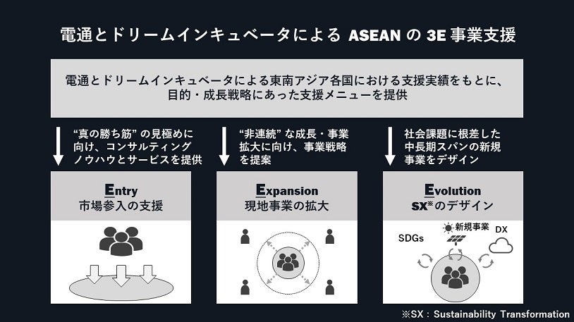 こうした状況を踏まえ、DIと電通は、それぞれの異なる強みを融合したビジネストランスフォメーション支援ソリューション「ビジネスプロデュース・サポート・プログラム」を共同で提供していくことにしました。DIの「社会・産業・企業の課題を重ねて捉えた上での、官民の連携も含む枠を超えた新事業創造力」と、電通の「グローバルネットワーク力、クリエイティブな価値創出力・実行力」を統合し、事業の川上から川下まで、またB2B、B2Cから「B2B2S(Business to Business to Society)」までのトランスフォメーションを、3つの「E」領域(Entry、Expansion、Evolution)で支援していきます。今回は第一弾として、日本企業のニーズが高いASEAN市場からサービスを開始し、順次その地域を広げていく予定です。