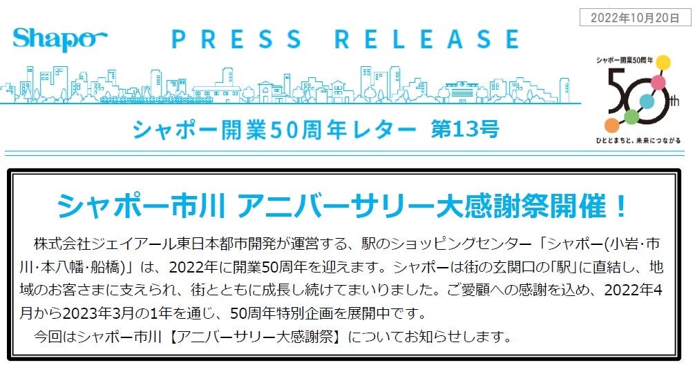 2022年10月21日(金)~31日(月)の期間中、シャポー市川では、開業50周年を記念した「アニバーサリー大感謝祭」を開催いたします。