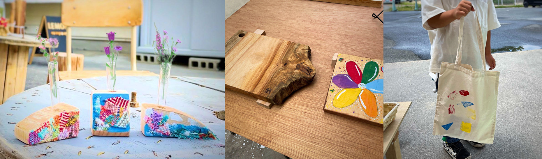 滋賀県内の製材所から出る端材や広葉樹をリメイクした木のおもちゃ、雑貨工などを販売。
