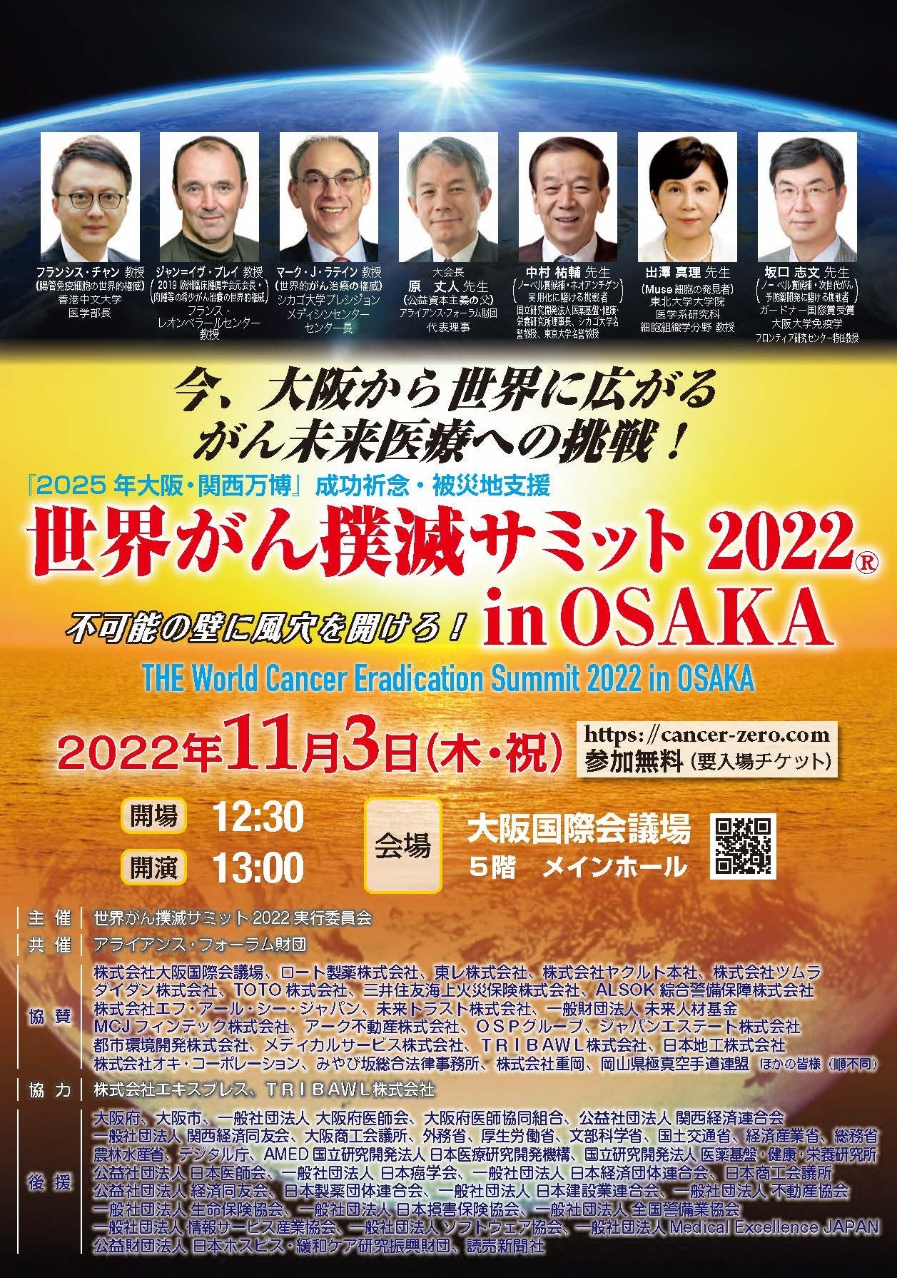2022年11月3日(木・祝)午後1時(開場12時30分)より大阪国際会議場で開催される『世界がん撲滅サミット2022 in OSAKA』(https://cancer-zero.com)。