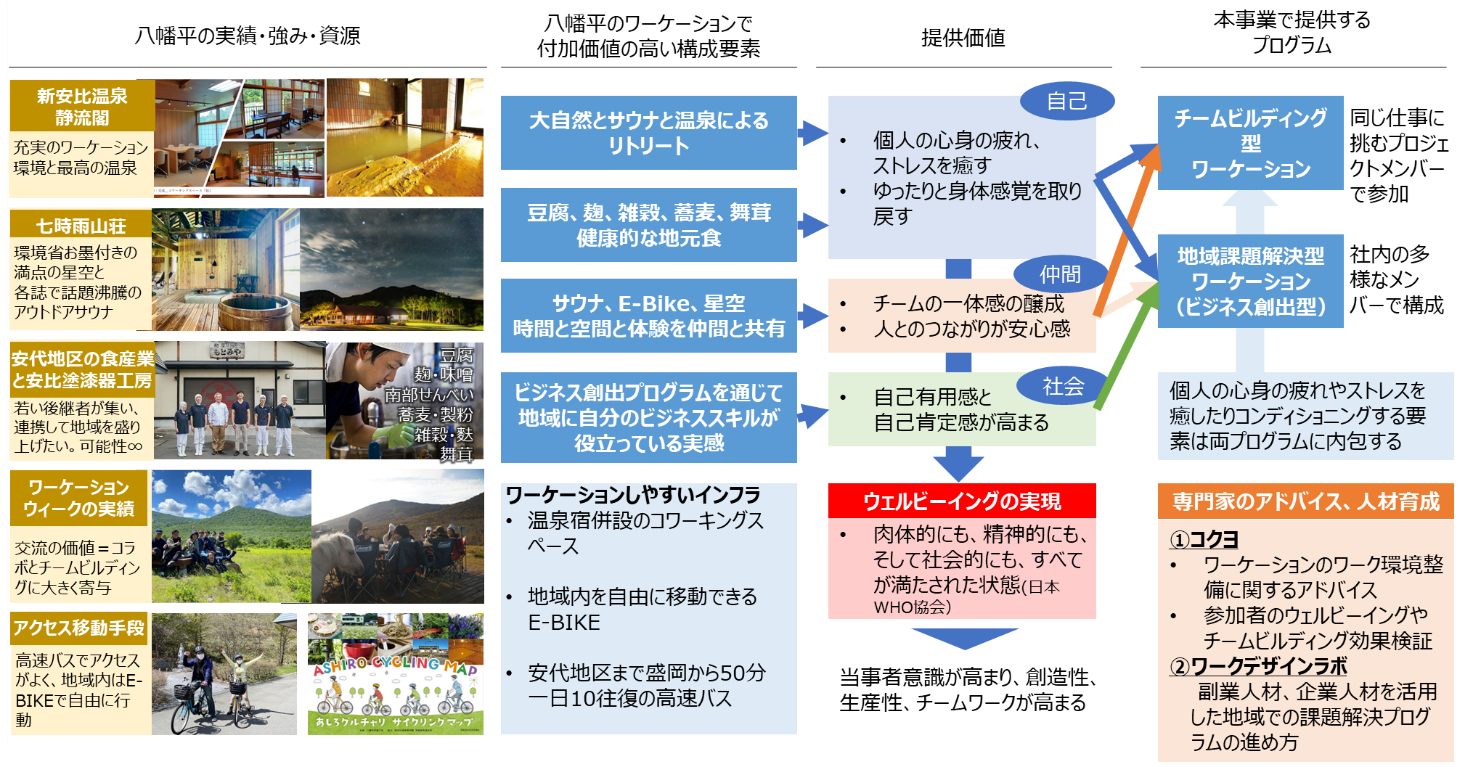 今回、その新安比温泉静流閣がホストとなり、同施設が提供する快適なワークスペースと強塩泉の癒し、地元食材をふんだんに使った健康食に加えて、近隣の七時雨山荘の本格的アウトドアサウナ施設によるウェルビーイング、また、「ビジネス創出型ワーケーション」につながる安代地区の食産業事業者との交流を提供し、八幡平DMOは実証実験の現地側の調整と事務局を担います。