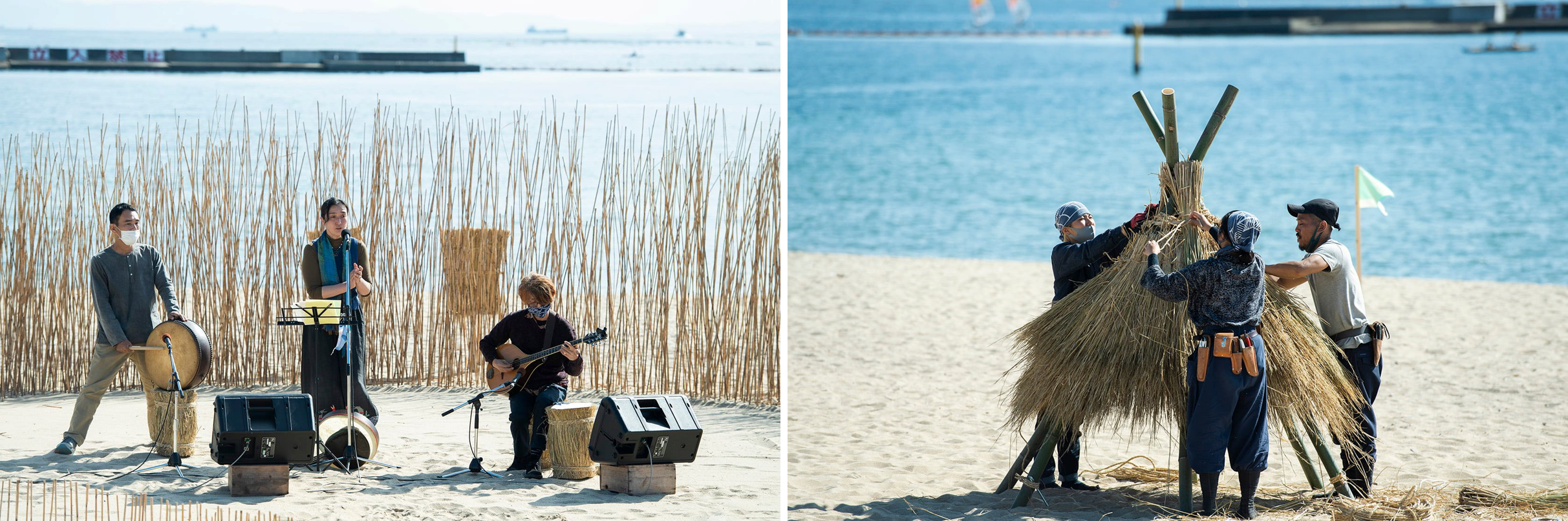 3.六甲山間伐材を使ったカホン(打楽器)づくりワークショップや、茅葺体験、ビーチヨガなど神戸の魅力を体感できるワークショップ