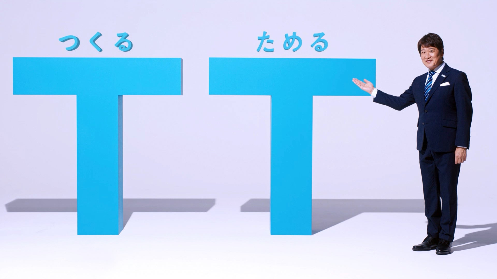 HTTの大きなオブジェを背景に、「節電・節ガスなど、エネルギーの使用量を『へらす』のHはもちろん大切ですが、『つくる』『ためる』のTTも重要なんです」と、まるで予備校の講義さながらに視聴者に訴えかけます。