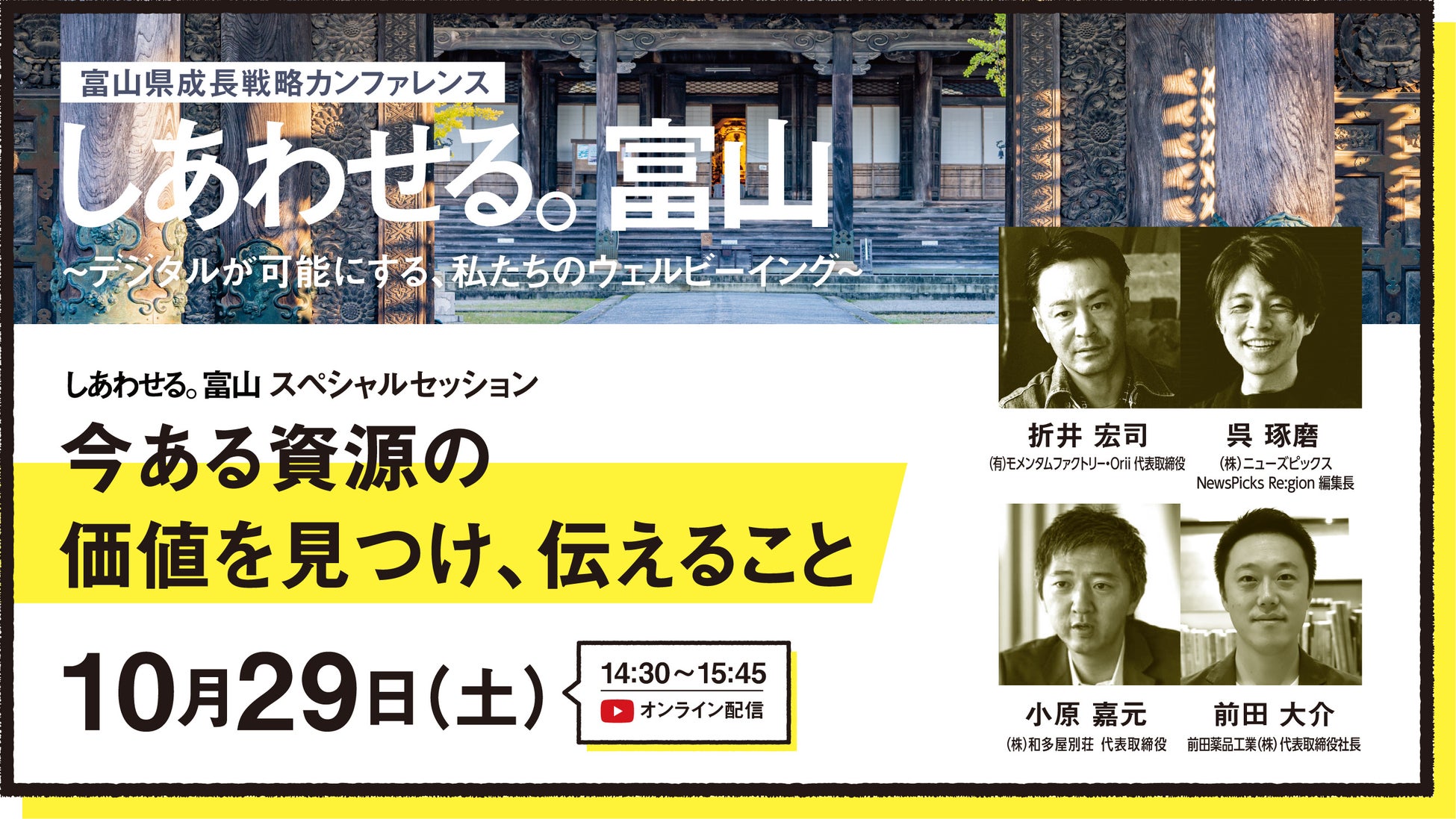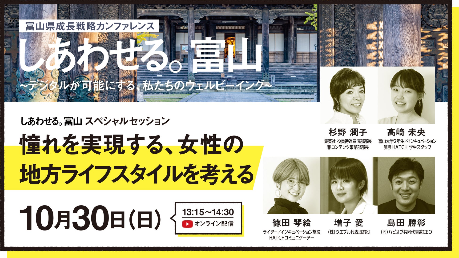 2回目の開催となる今回は、南砺市井波にある瑞泉寺をメイン会場に、富山が目指す未来に共感する多彩なゲストを県内外が集い、デジタルの活用によるウェルビーイングの実現について語り合います。