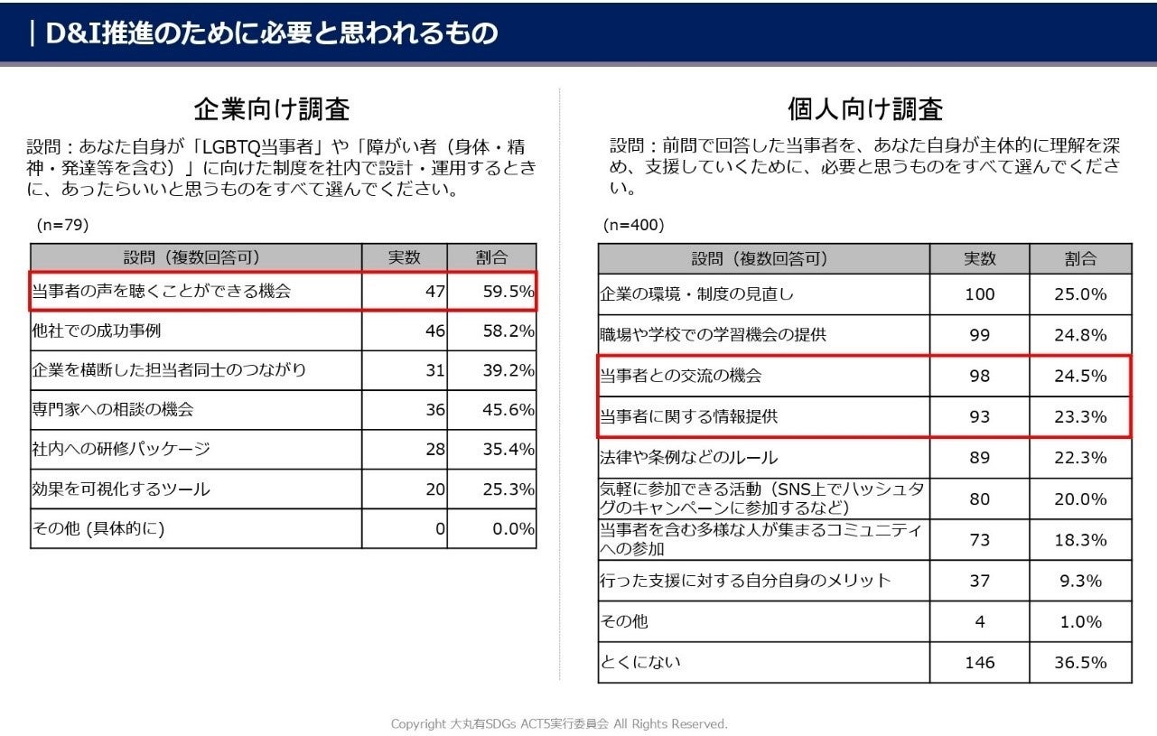 - 3.D&I推進のカギは、個人・企業担当者ともに「当事者との交流」が上位に。