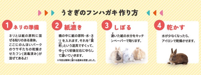 開催日当日、のんほいパークにご来場された親子・お子様を対象に、うさぎのフンを混ぜ合わせた液を使った本格的なハガキ作り体験イベントを開催いたします。当日手作りしたハガキはプレゼントしておりますので、ご家族の思い出づくりとしていかがでしょうか?