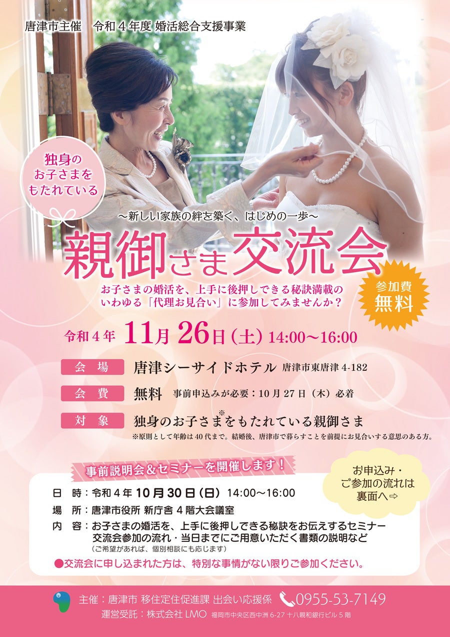 地方自治体の婚活支援を手掛ける株式会社LMO(本社:福岡市中央区 代表取締役:高田康太)は、佐賀県唐津市から委託を受け、11月26日(土)、唐津シーサイドホテルにおいて、『親御さま交流会(代理お見合い)』を開催することになりましたので、報道機関のみなさまへお知らせします。