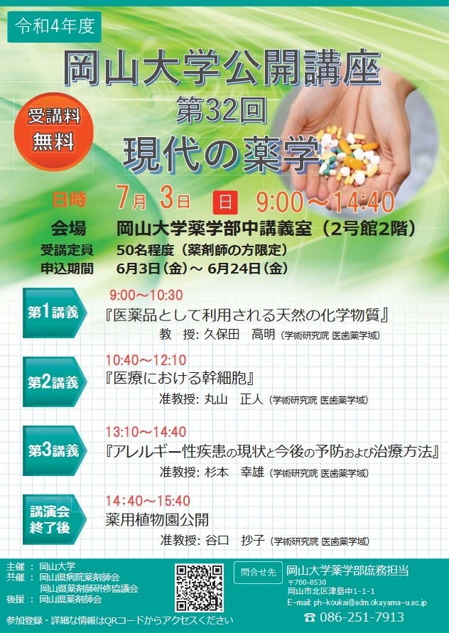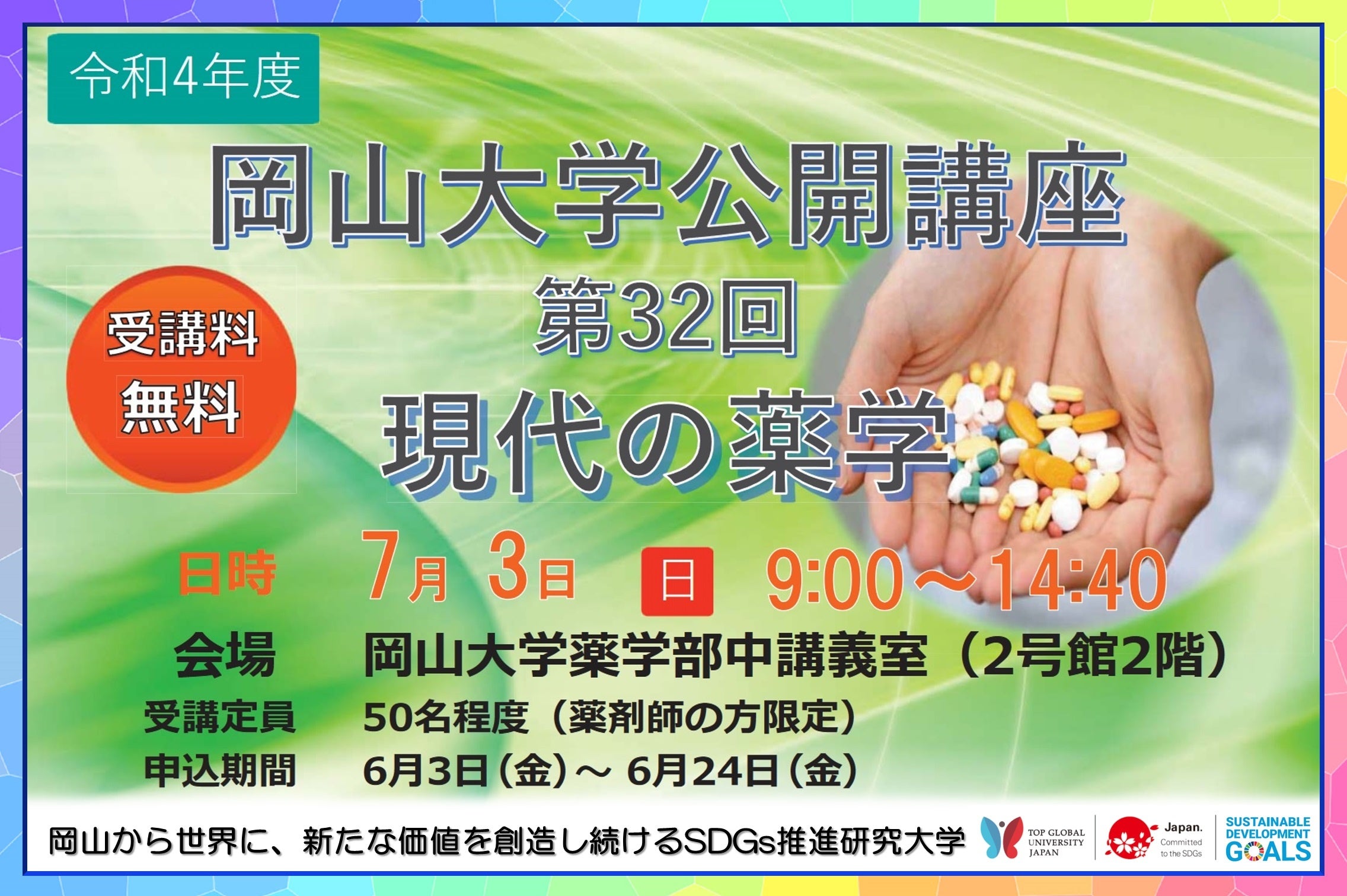 国立大学法人岡山大学(本部:岡山市北区津島中、学長:槇野博史)では、令和4年度の岡山大学公開講座「現代の薬学(第32回)」を、2022年7月3日(日)9:00~14:00に岡山大学津島キャンパスの薬学部(岡山市北区)において、対面形式で開催いたします。