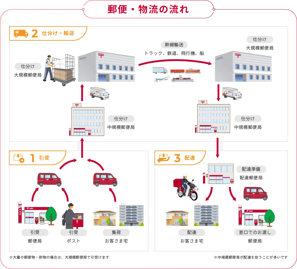 タイミング:【1.引受】【2.仕分け・輸送】【3.配達】