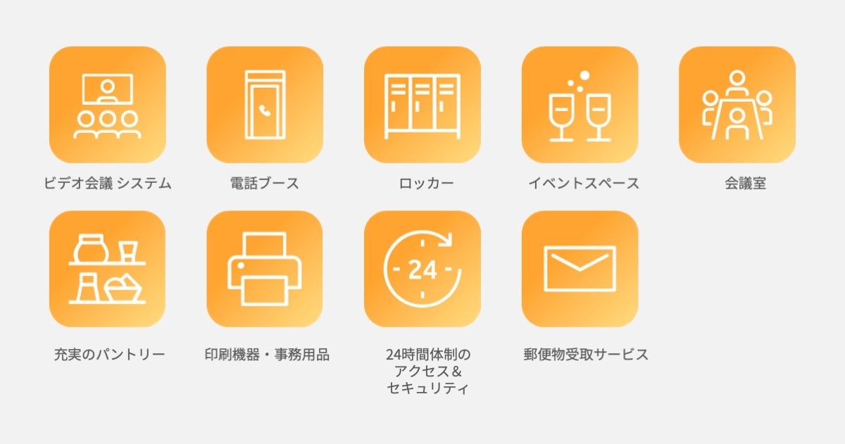 会話をしながら仕事ができる共用スペースをはじめ、ビデオ会議システムを備えた会議室、電話ブース、ロッカー、イベントスペース、豊富なドリンクを備えたパントリー、コピー複合機など、必要なものを取り揃えています。施設は24時間利用可能で、平日9時~18時はバイリンガルの受付スタッフが常駐しています。