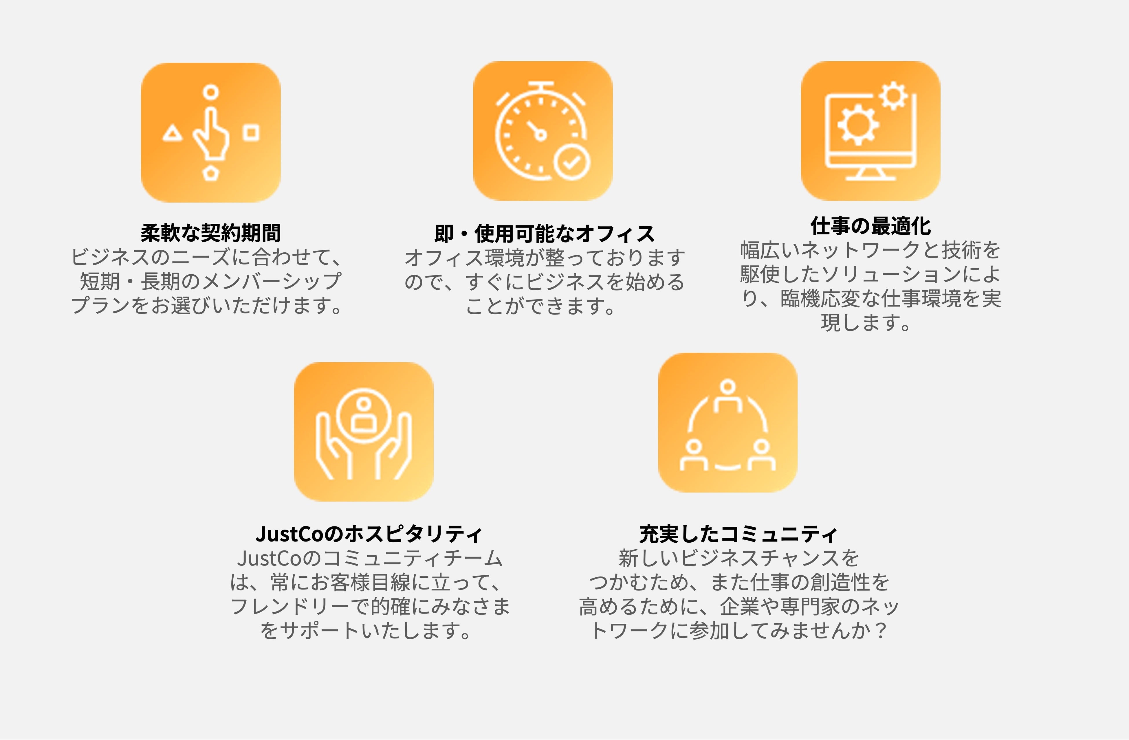 お客様のニーズに合わせて柔軟なご契約期間の設定が可能です。また、デスクや家具を揃える必要もなく、ご契約後すぐにご利用いただけます。受付や日々のオフィスサポートは、常駐しているJustCoのコミュニティチームがフレンドリー且つ的確に対応いたします。