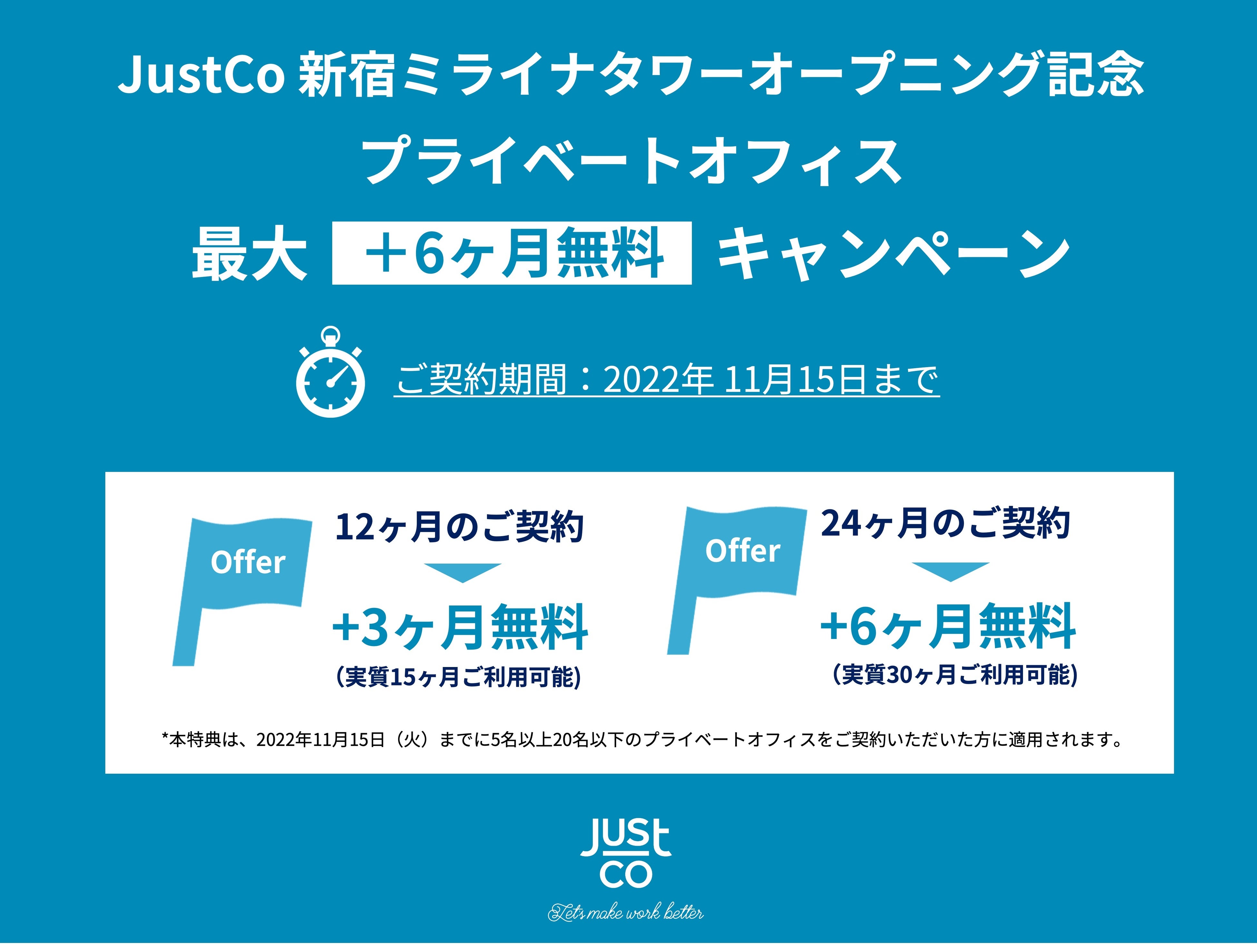 JustCo新宿ミライナタワーのグランドオープンを記念して、プライベートオフィスをご契約いただいた方限定で、最大+6ヶ月無料になるキャンペーンを実施中です。