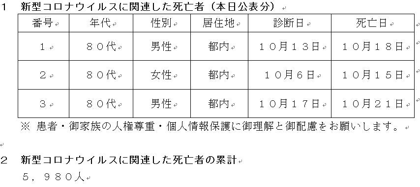 新型コロナウイルスに関連した患者の死亡について business Twitter Facebook はてブ Pocket LINE コピー 2022.10.24 この記事は約1分で読めます。 都内で新型コロナウイルスに感染した方が死亡されましたのでお知らせします。 お亡くなりになった方のご冥福をお祈り申し上げます。