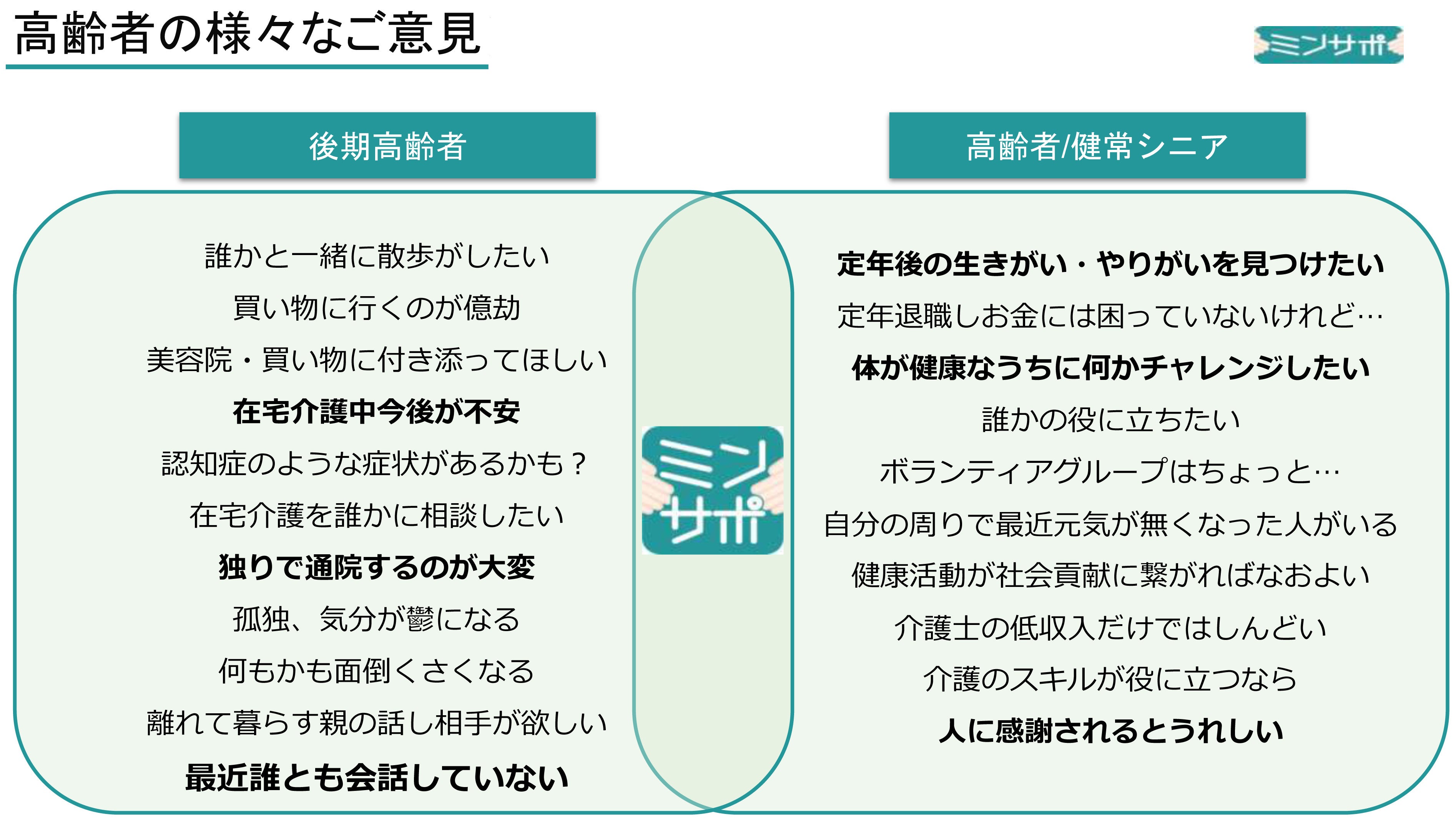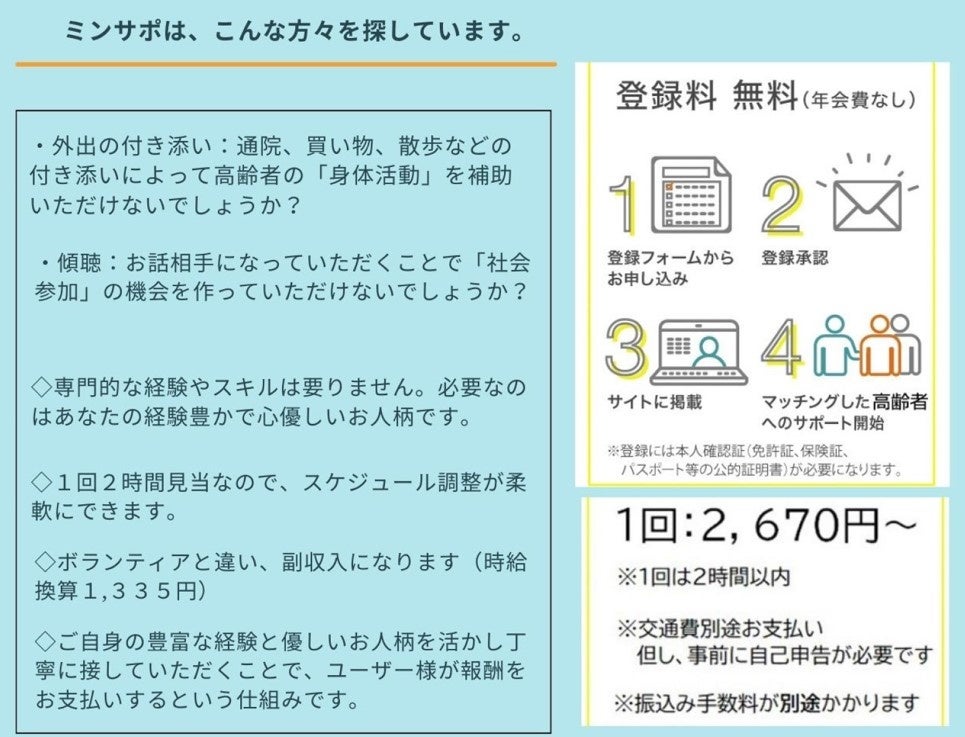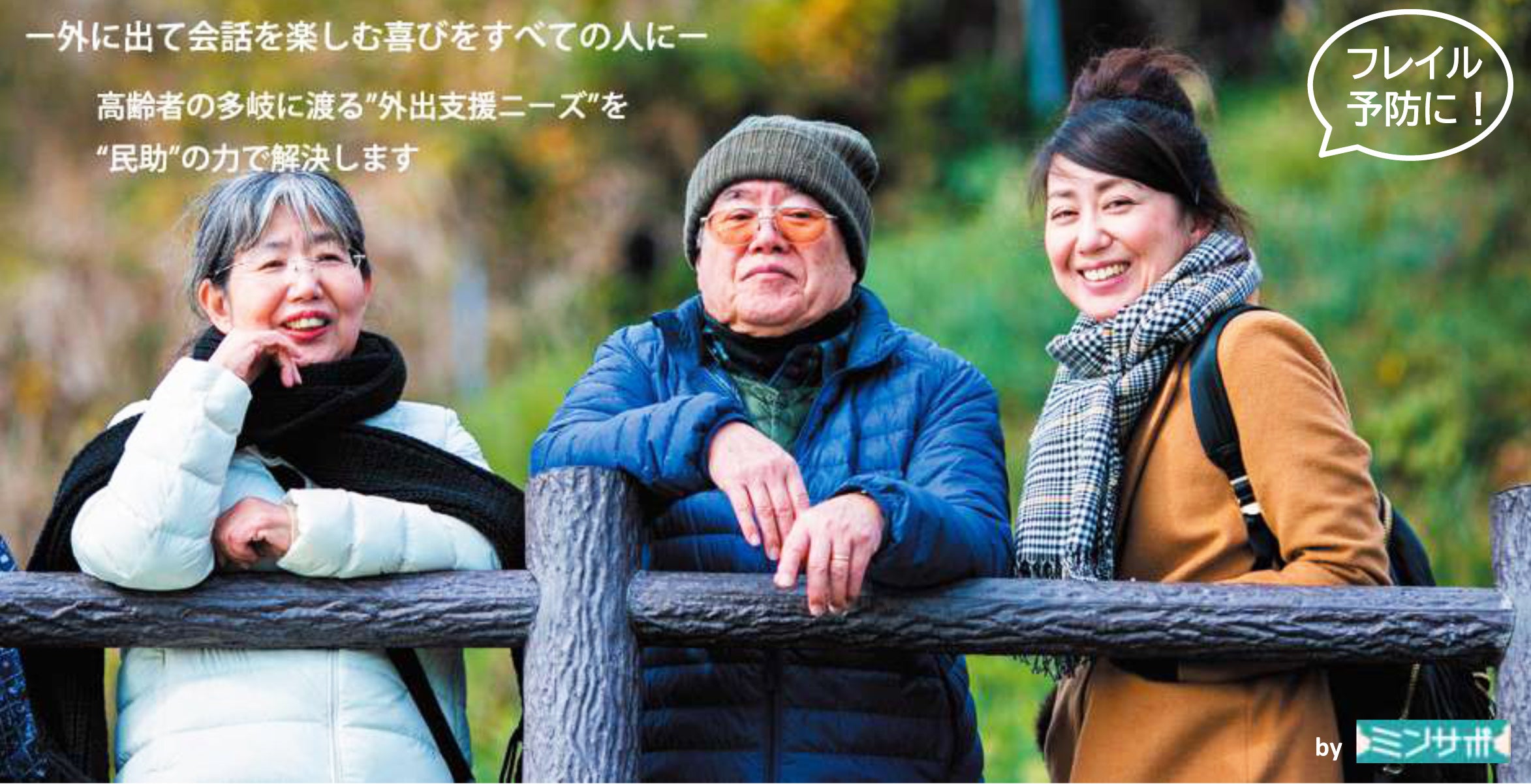 新型コロナウイルスの影響で〈フレイル〉(*1)問題が深刻化し外出支援ニーズも増加している今、〈外出付き添い・傾聴〉サービスの提供が急務と考え、身体活動や社会参加によって可逆性のある〈フレイル〉(*1)予防に特化し、健常なシニア層の生きがい発見の機会にもつながる介護保険外サービス【ミンサポ】をスタートすることといたしました。