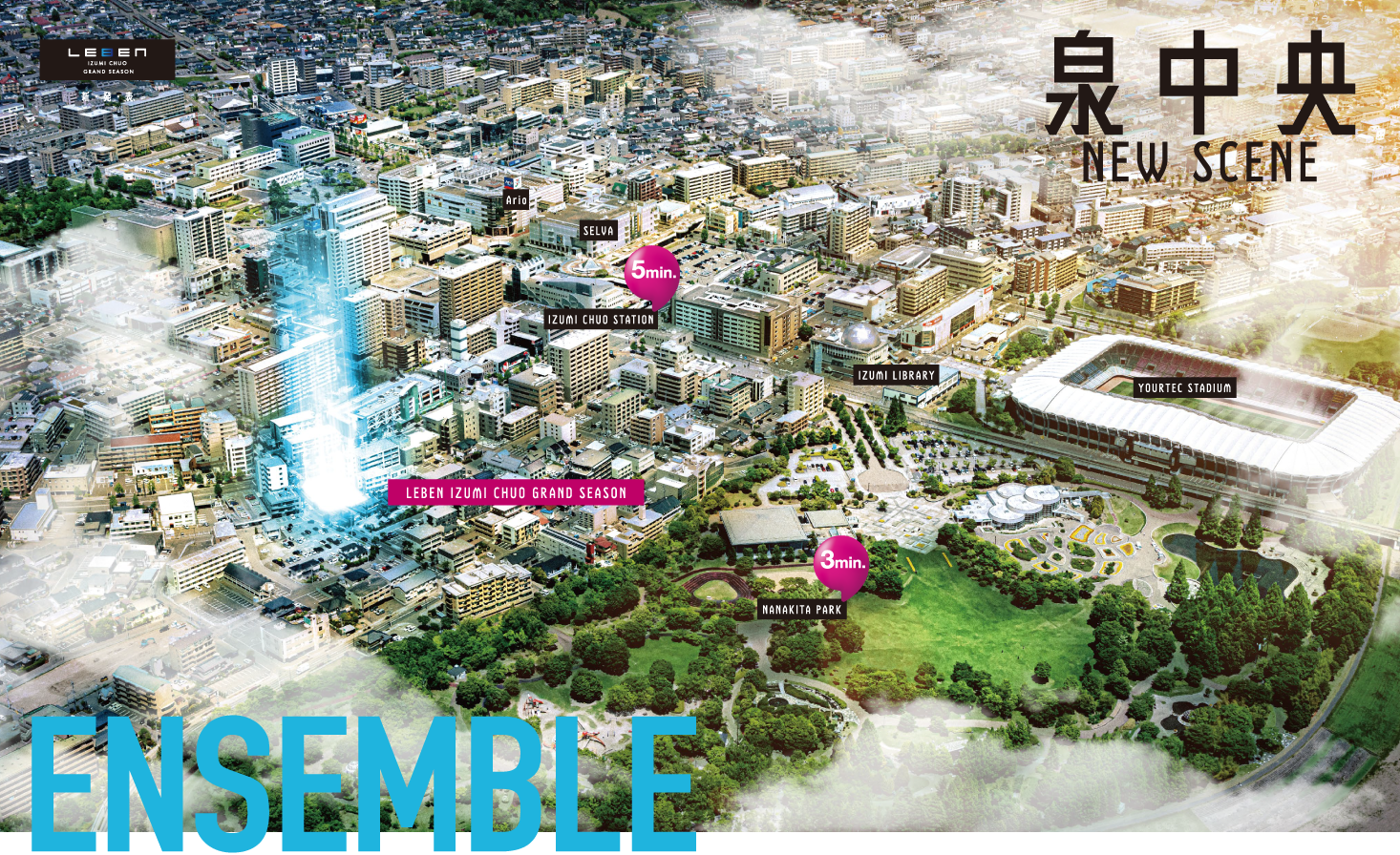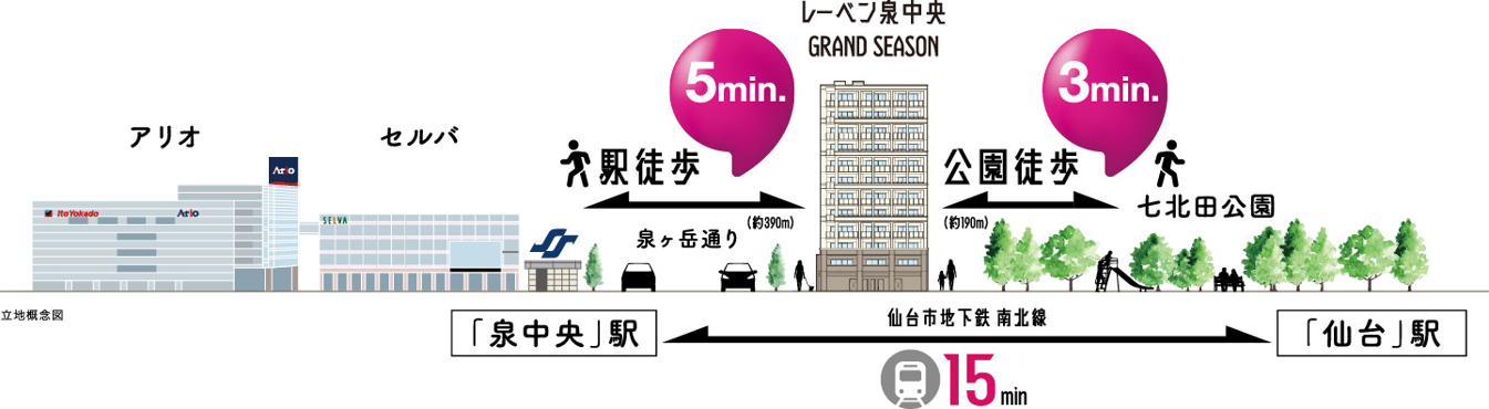 多彩な利便が揃う駅の賑わいを抜けて徒歩5分。緑潤う並木の先に「レーベン泉中央 GRAND SEASON」は誕生します。仙台の副都心として常に人気の街としてランクインする「泉中央」は、地下鉄南北線で「仙台」駅までは乗り換えなしで15分というアクセスの良さも魅力です。街の洗練や利便を満喫しながら、豊かな自然の潤いも間近に感じられる、まさに暮らしの理想型が「泉中央」といえるでしょう。