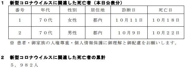 新型コロナウイルスに関連した患者の死亡について business Twitter Facebook はてブ Pocket LINE コピー 2022.10.25 この記事は約1分で読めます。 都内で新型コロナウイルスに感染した方が死亡されましたのでお知らせします。 お亡くなりになった方のご冥福をお祈り申し上げます。