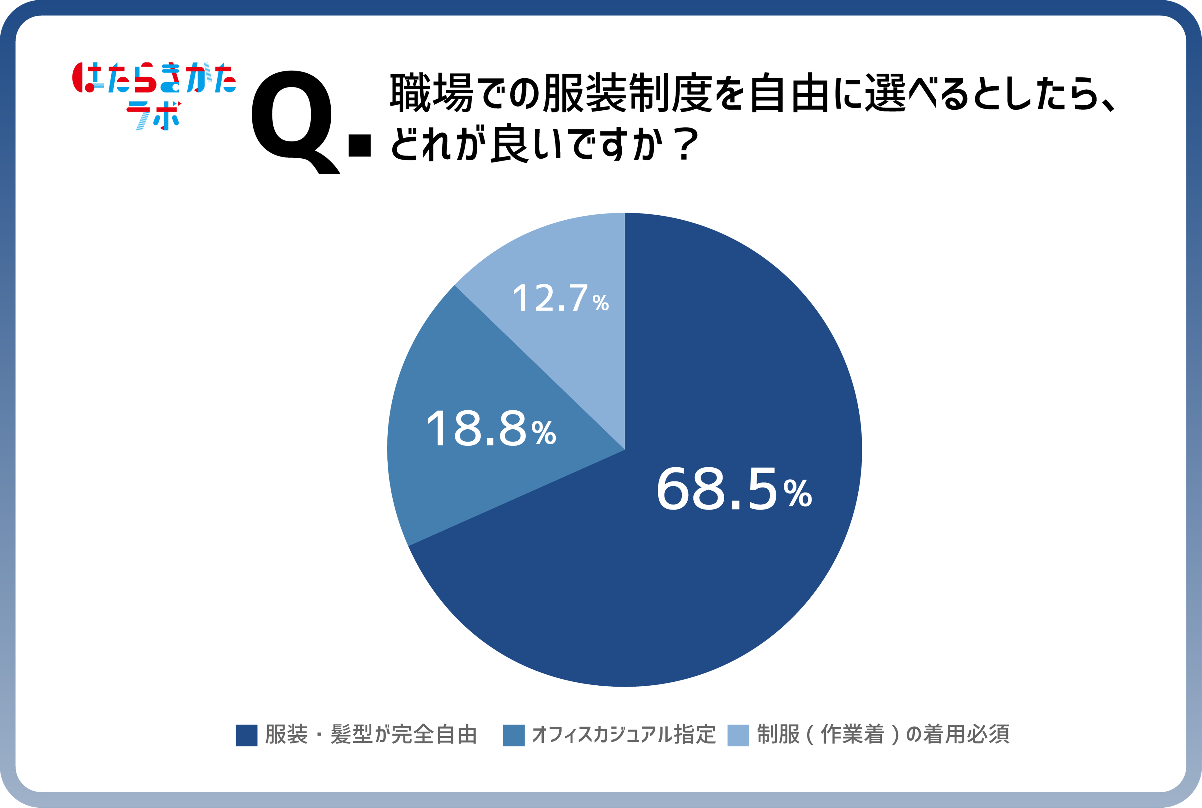 また、「職場での服装制度を自由に選べるとしたら、どれが良いですか?」という質問では、1番多かったのが「服装・髪型が完全自由」で68.5%、次いで「オフィスカジュアル指定」が18.8%、「制服(作業着)の着用必須」12.7%という結果となり、「服装・髪型が完全自由」の職場で働きたいと思っているZ世代が多いことがわかりました。