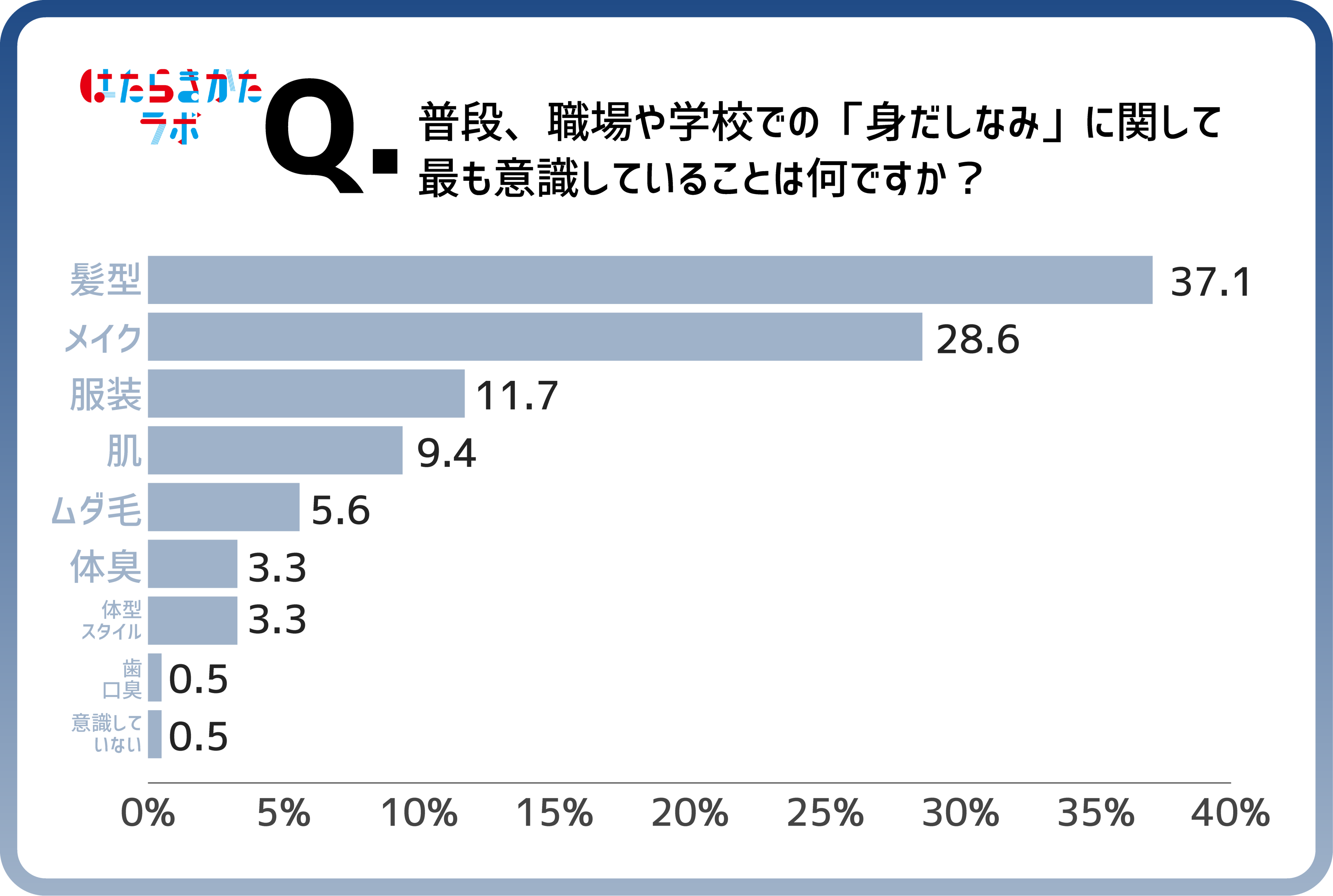はたらきかたラボメンバーにも同じ質問をしたところ、「服装」が4名、「髪型」、「メイク」が1名ずつという結果になりました。理由について、「服装」を選んだ人は「昔から洋服が好き。好きな服を着ることが日々のモチベーションに繋がっているので一番意識している」(23歳・大学4年生・女性)と、好きな服を着ることで自分のモチベーションを保っているという意見や、「服装を意識し始めたのは社会人になってから。直接人に会って話を聞くのが多い仕事なので、第一印象で相手に心のシャッターを降ろされてしまうと仕事にならないこともあり気を遣っている」(25歳・社会人3年生・男性)など、仕事柄、身だしなみを意識していているといった意見がありました。また「髪型」を選んだ人は「制作の仕事をしていて現場によっては出勤時間が朝早いことがあるため、フルメイクをするのは難しい日もある。だが、髪型はメイクほど時間をかけずに整えられるし、清潔感も増すので整えるようにしている」(23歳・社会人2年目・女性)など、身だしなみを意識する理由は「自分の気分を上げるため」といった“自分目線”なのか、「相手に不快感を与えないため」といった“相手目線“なのかで人によって異なるようでした。