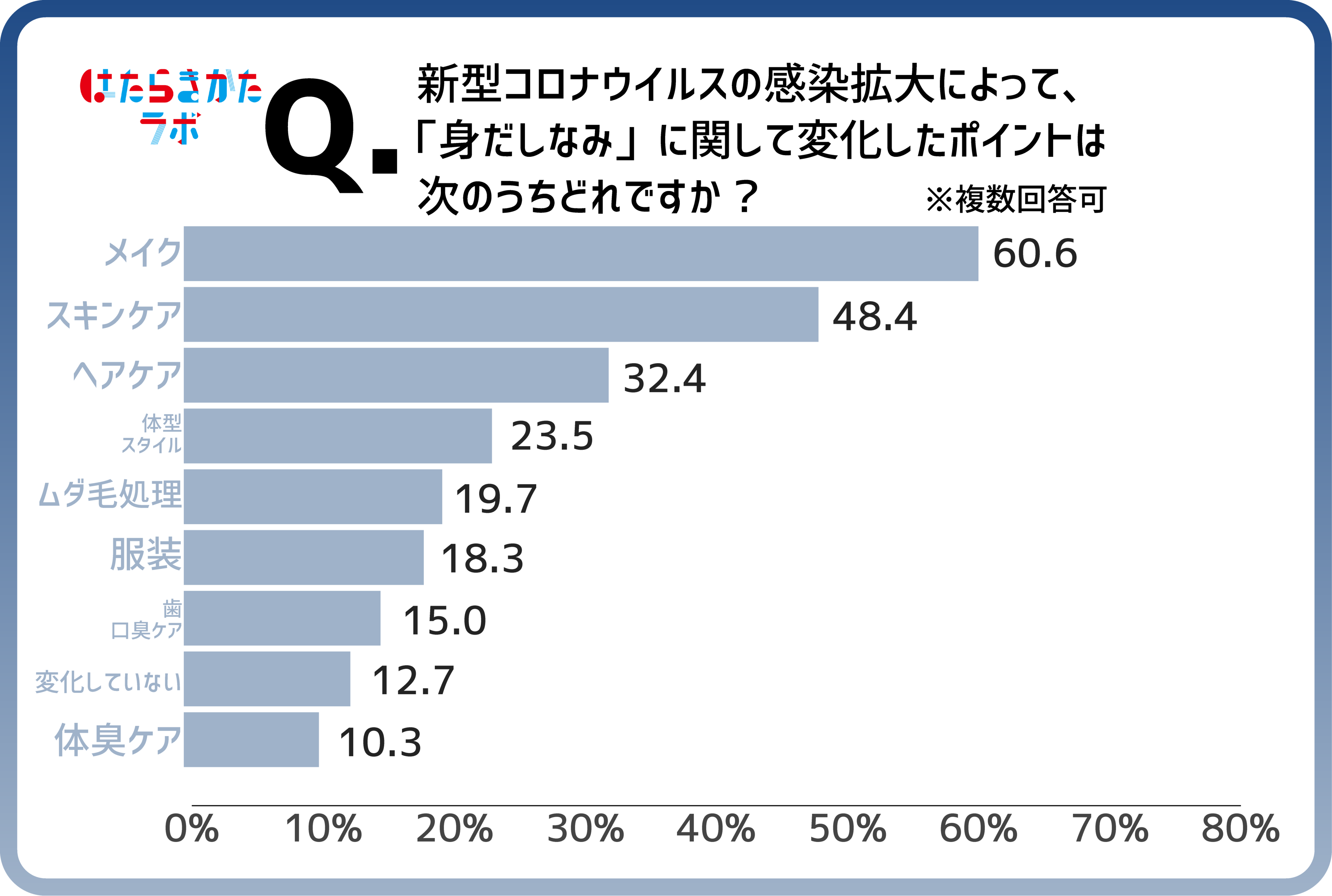 次に、「新型コロナウイルスの感染拡大によって、“身だしなみ”に関して変化したポイントは次のうちどれですか?」という質問では、「メイク」が60.6%で最も多く、次に「スキンケア」が48.4%、「ヘアケア」32.4%、「体型・スタイル」23.5%という結果となりました。前述の自由回答の中にも「コロナで顔がマスクで隠れているので髪型はきちんとしている」「リモートの時は目元(のメイク)を特に気にする」など、以前は意識していなかった“身だしなみ”のポイントを、コロナ禍によって気にするようになったと捉えられる回答もありました。