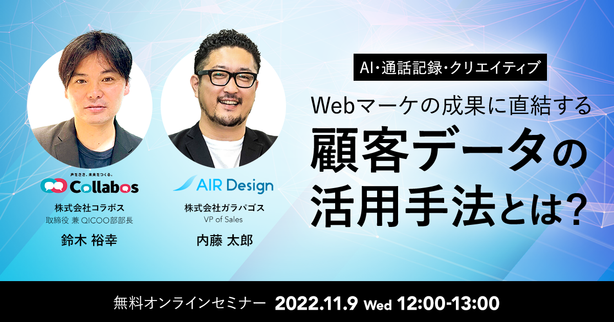 本セミナーでは、コールセンターの通話記録から顧客に刺さる訴求を生み出す新サービスをリリース予定の株式会社コラボスと、AIを活用したデータ解析やデータを活用したWebマーケティングプランニングのプロ集団・AIR Designが、データから顧客を理解し、事業成長につなげるための方法を事例を交えてお伝えします。