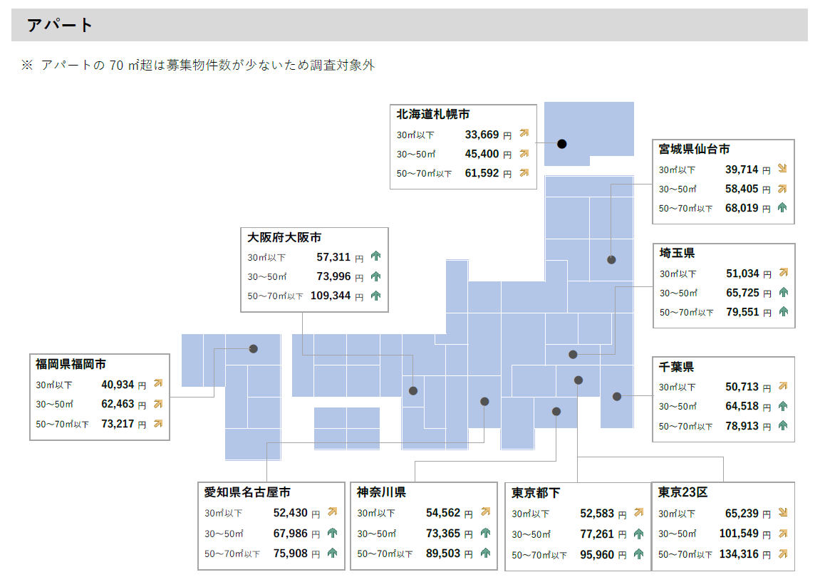 <2022年9月 全国主要都市における賃貸マンション・アパートの平均家賃(面積帯別)>