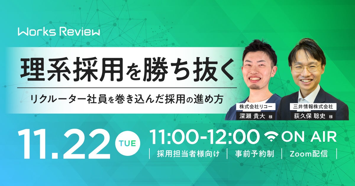 大学へのアプローチがなかなかできなかった2年を経て、理系採用における母集団形成や学生へのアプローチ方法も変化しています。また、勤務地確約など条件を重視する学生は増えており、仕事やキャリアの魅力付けにあたって、リクルーターを巻き込んだ全社的な採用活動ができるかが重要になってきております。今回のWORKS REVIEWでは、現場を巻き込む体制作りから、学生へのアプローチ方法や現場社員とのコミュニケーション方法など、具体的な取り組み事例について、株式会社リコー様と三井情報株式会社様からお話をお伺いいたします。