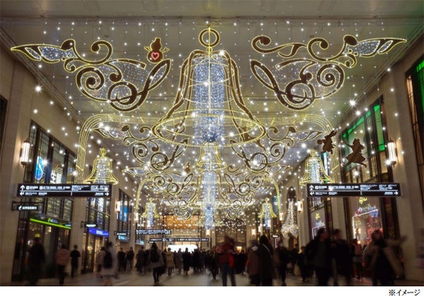 天井に浮かび上がる五線譜上に光のベルが鳴り響き、一歩進むたびに違う世界が目の前に広がっていく、重厚であり幻想的なコンコースの空間を活かしたイルミネーション。