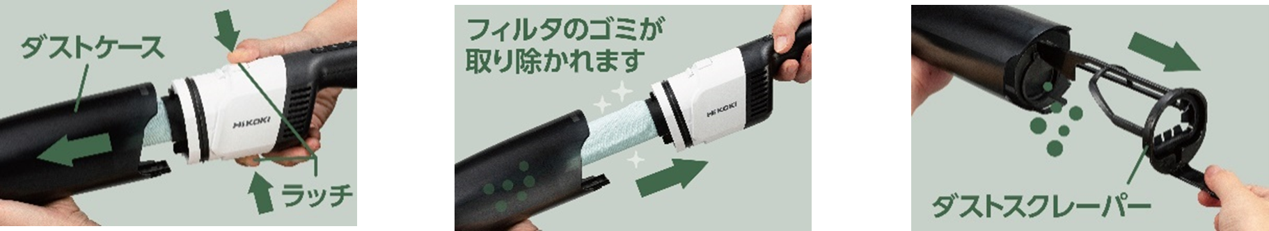 ■ダストケースを外し、ダストスクレーパを引っ張るだけで簡単ゴミ捨て