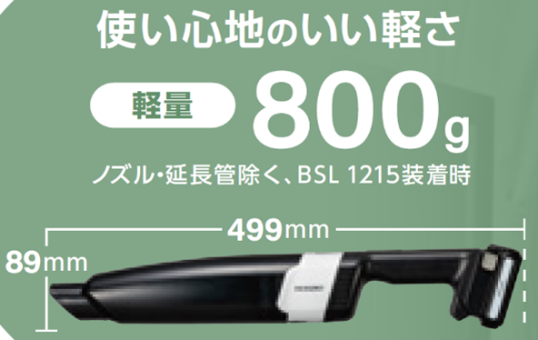 ノズルと延長管を除いた本体は800g※1と軽量で使い心地のよい軽さです。ハンディとしても使用できます。