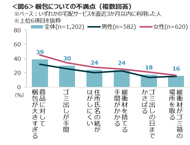 梱包についての不満点は「商品に対して梱包が大きすぎる」「ゴミ出しが手間」「住所氏名の紙がはがしにくい」「緩衝材を捨てる手間がかかる」などがあがった。特に女性ではいずれの不満点も高い。<図6>