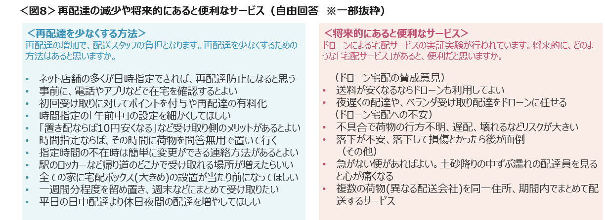 再配達を少なくする方法として「日時指定の徹底」が多くあがった。そのために、指定時間を細かくする/宅配ボックスの設置/置き配優先や再配達の有料化の声があがった。ドローン宅配は、送料が安くなる/夜の配達が増える/ベランダで受け取れるといった期待がある一方、ドローンの不具合による落下、遅配、荷物の損傷を不安視する意見もみられた。<図8>