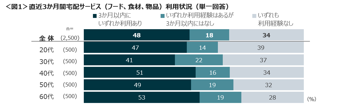 直近3か月のフードデリバリー、食材・物品の宅配サービスいずれかの利用率は48%、40代と60代では半数を超える。<図1>