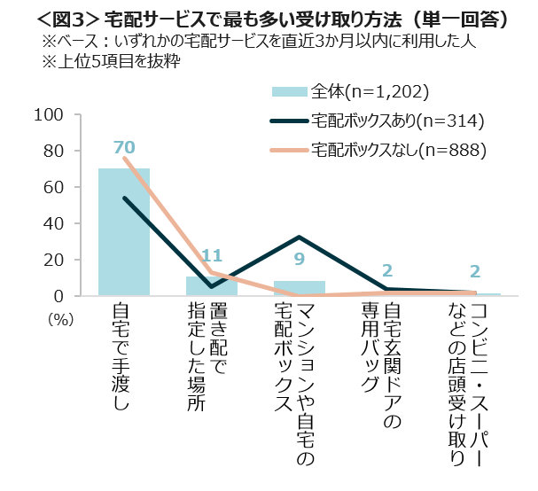 宅配サービスの受け取り方法は、「自宅で手渡し」が突出して高い。次いで「置き配」「宅配ボックス」。宅配ボックスのある家庭でも「自宅で手渡し」が最も多かった。<図3>