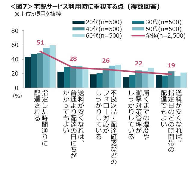 宅配サービスを利用する際に重視する点は、「指定された時間通りに配達される」が半数を超える。次いで「送料が安くなれば、普通より配達の日にちがかかってもよい」「不良返品・配達確認などフォロー対応がしっかりしている」など。「指定した時間通り」は50代、60代の割合が高い。<図7>