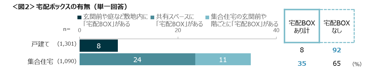 宅配ボックスの設置率は、戸建てで8%、集合住宅では35%であった。<図2>