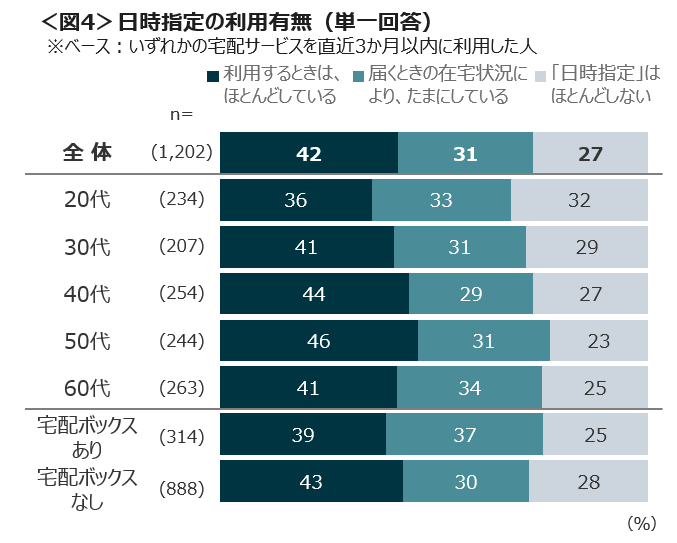 日時指定について「ほとんど利用」が42%、「たまに利用」は31%であった。40代と50代の「ほとんど利用」は高い。宅配ボックスのある家庭でも「ほとんど利用」は39%を占めている。<図4>