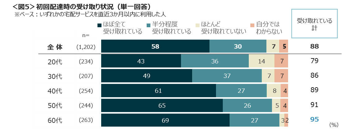 初回配達時で「ほぼ全て受け取れている」は58%、「半分程度受け取れている」は30%と合わせて88%は”受け取れている”と回答。特に、40~60代は「ほぼ全て受け取れている」割合が6~7割と高い。<図5>
