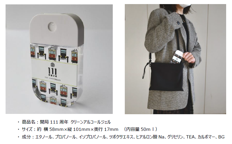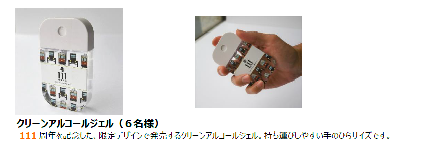 111周年を記念して、数量限定の「クリーンアルコールジェル」を発売します。111周年の限定デザインです。アルコールジェルは無色・無香なのでシーンを選ばずにお使いいただけるとともに、持ち運びしやすいサイズとなっています。除菌や感染予防をしながらデジタルスタンプラリーにもご参加いただけます。(容器は繰り返しご利用頂けます。)