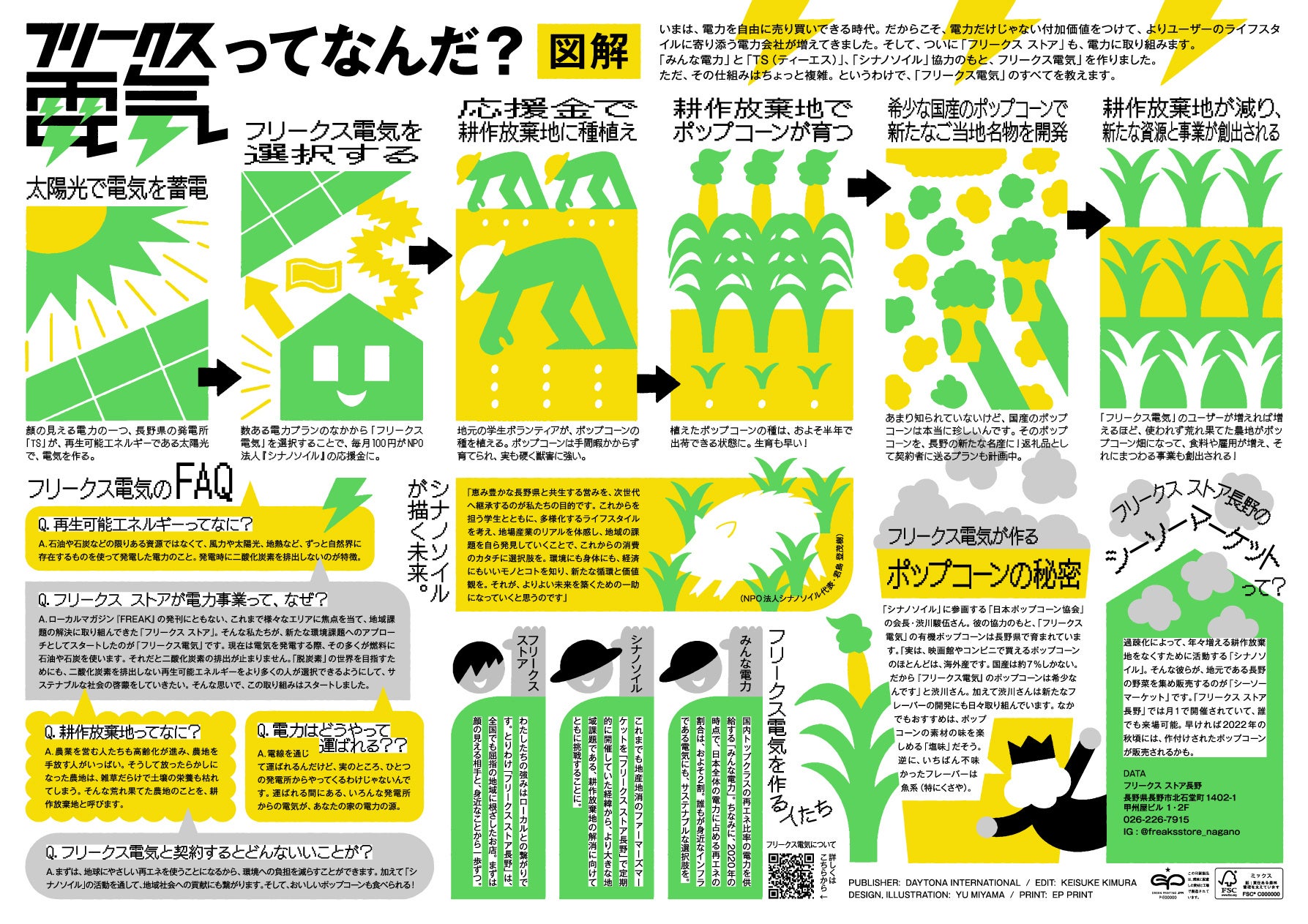 「フリークス電気」は、そんな作物を育てられる環境にあるにもかかわらず耕作される予定のない「耕作放棄地」にポップコーンの実を育てる学生ボランティア中心のNPO法人「シナノソイル」へ、契約金のうち毎月100円を応援金として届ける。地球に配慮したサステナブルな電力の「フリークス電気」を使用するユーザーが増えるほど、耕作放棄地がポップコーン畑になり、食料や雇用が増えていく。地産の再生エネルギーを選択することで、カーボンニュートラルへの貢献ができるだけでなく眠っていた地球の資源や若者の力を最大化し、地域経済の循環を目指す。