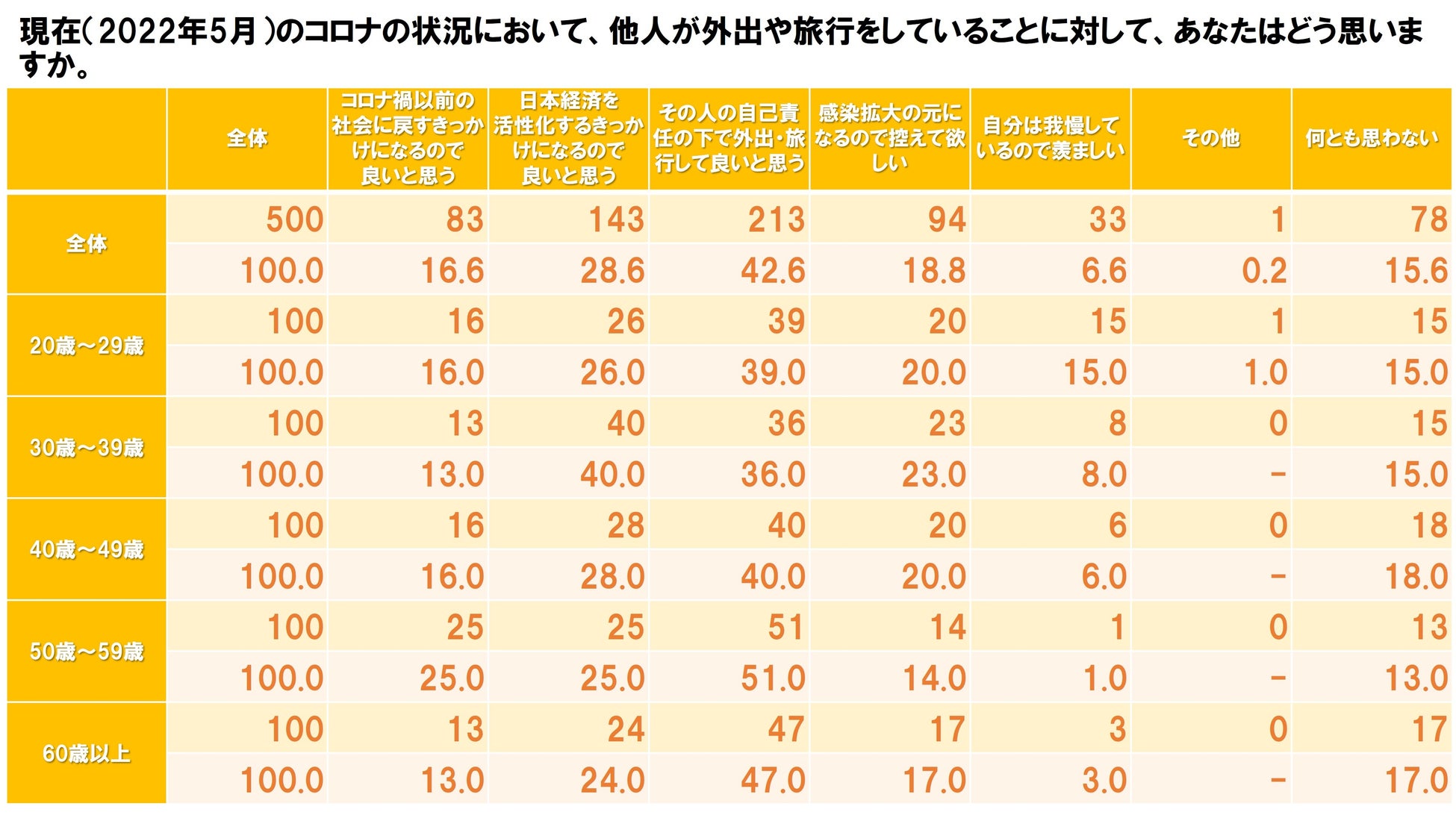 また、他者の外出や旅行に対して、全体的には行動を容認するものが多数を占める結果となった。その中で、“外出や旅行を羨ましく思っている”と回答した20代男女が15%と他の年代よりも突出して高く、より他者の行動を気にしていると受け取られる結果となりました。