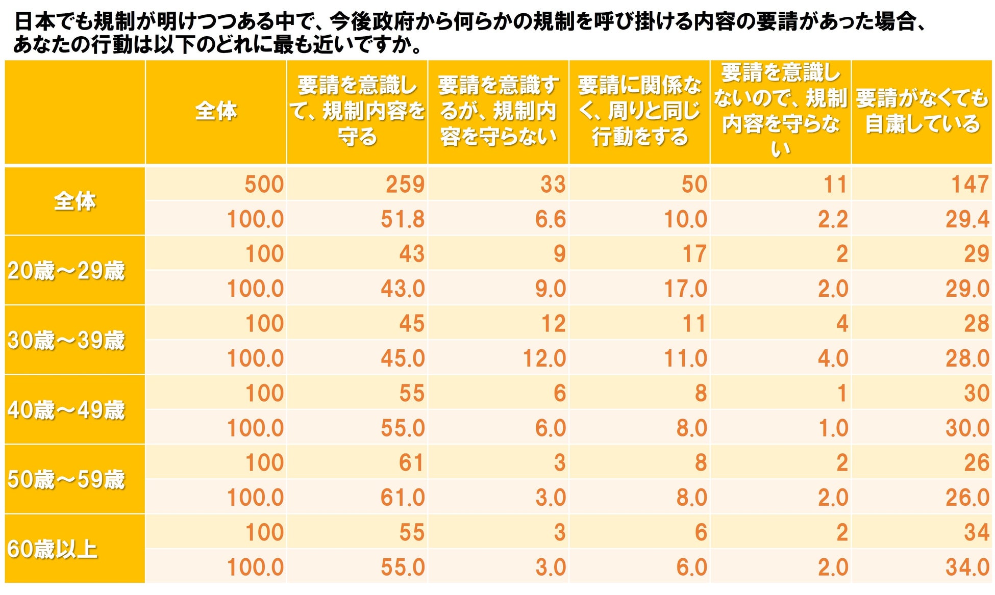 20代の男女に関して、規制を無視しがちというイメージを抱いている人もいるように思われますが、実際には“5割以上が規制を守り、3割近くが現在も自粛を行っている”という結果になりました。その中でも“周囲と同様の行動を取る”と回答した割合が17%と最も多く、他の年代に比べて他者の行動が本人の行動に影響しやすいことが見受けられる結果となりました。