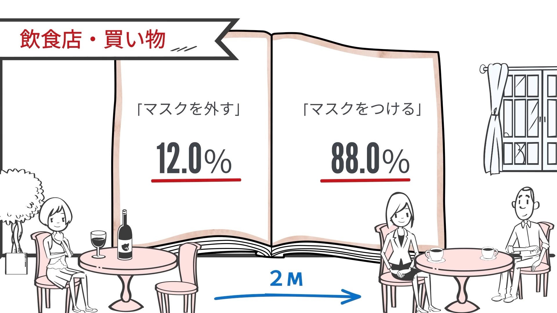 感染対策済みの飲食店やスーパーなど、屋内で人との距離が2メートル以上離れているところでは「マスクを外す」と回答した人が12.0%・「マスクをつける」と回答した人が88.0%でした。