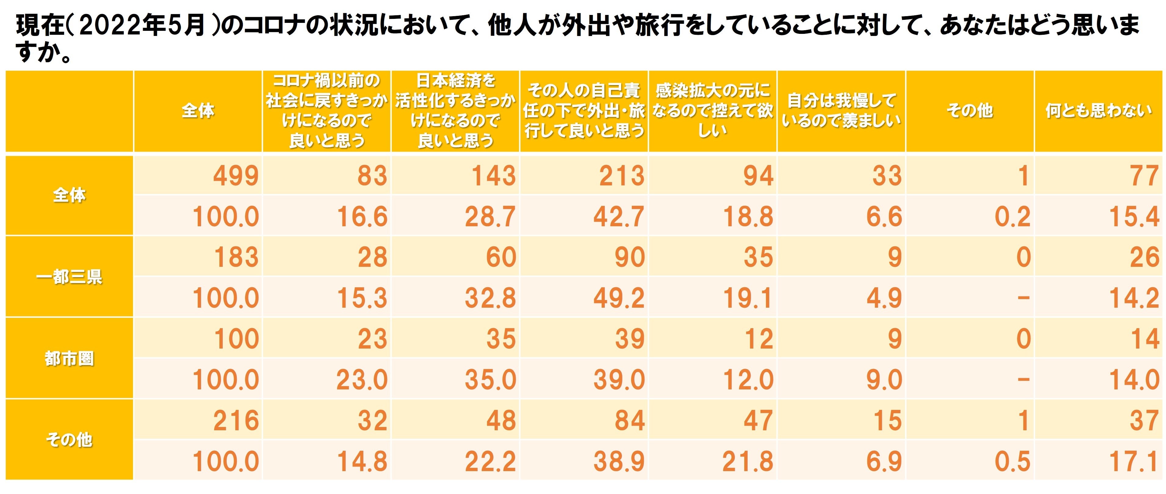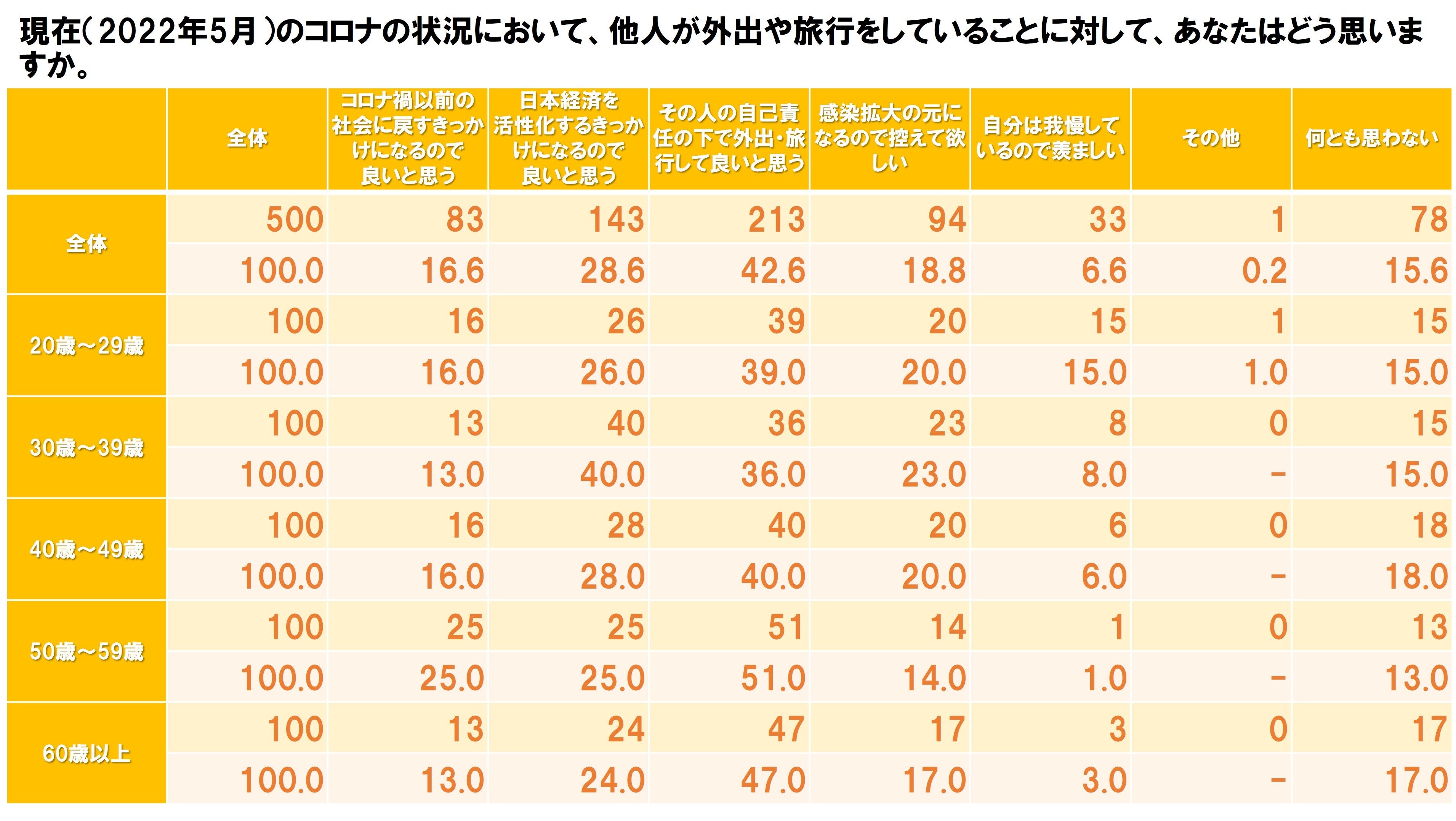 また、他者の外出や旅行に対して、全体的には行動を容認するものが多数を占める結果となった。その中で、“外出や旅行を羨ましく思っている”と回答した20代男女が15%と他の年代よりも突出して高く、より他者の行動を気にしていると受け取られる結果となりました。