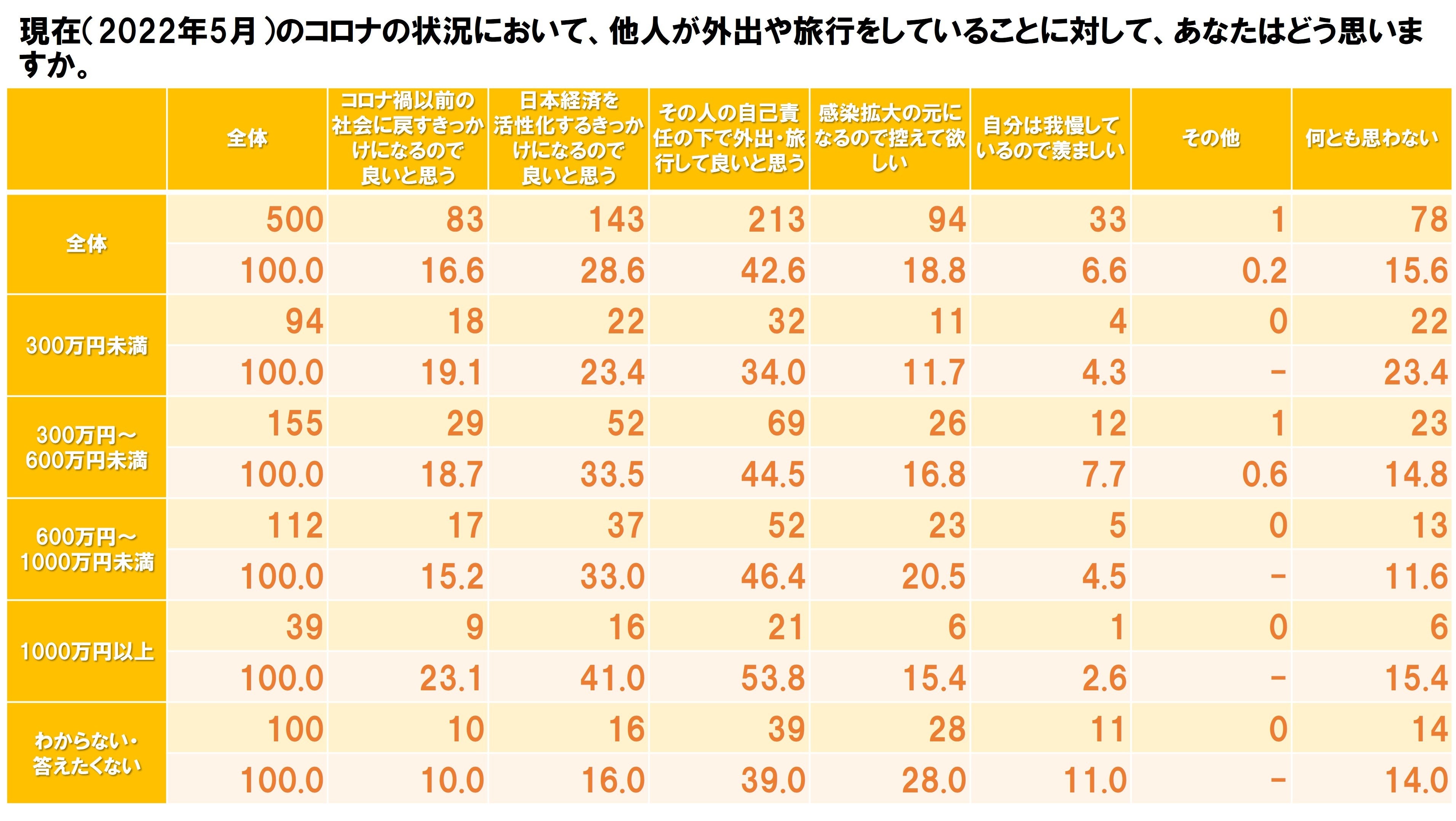 居住エリアによって差が見られた外出、旅行に対しての意識ですが、世帯年収によっての差は見られるのでしょうか?結果は上の表のように、世帯年収が高い回答者ほど外出や旅行に対してポジティブに捉えている結果となりました。