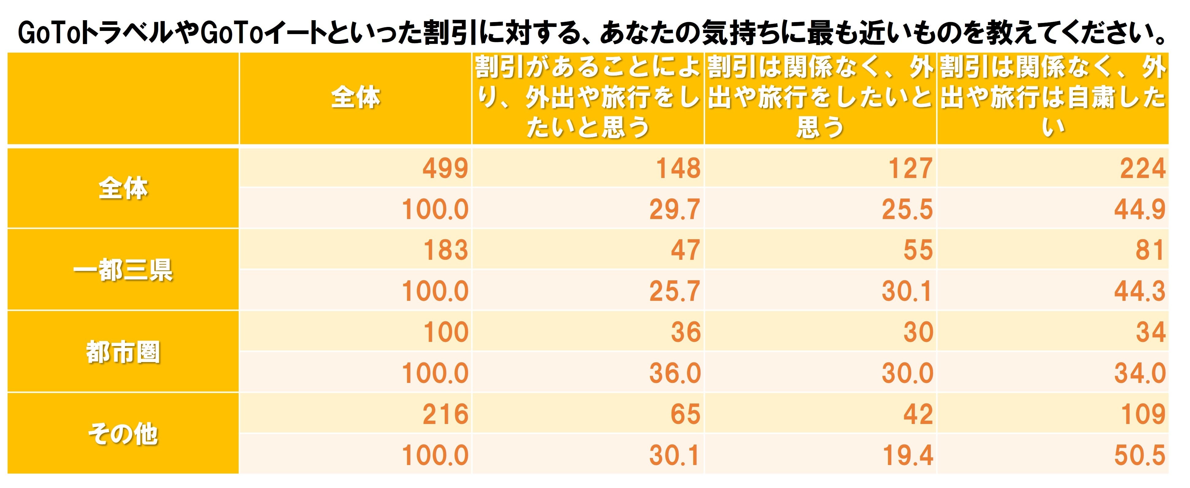 結果、一都三県を含む都市圏に居住する生活者は外出や旅行にポジティブに受け止められている結果に対して、その他のエリアに居住する生活者は若干その度合いが低い結果となりました。また一都三県に関しては外出や旅行に対してい自己責任とする割合が50%弱と最も多く、withコロナ生活への許容度が高いと見受けられる結果となりました。