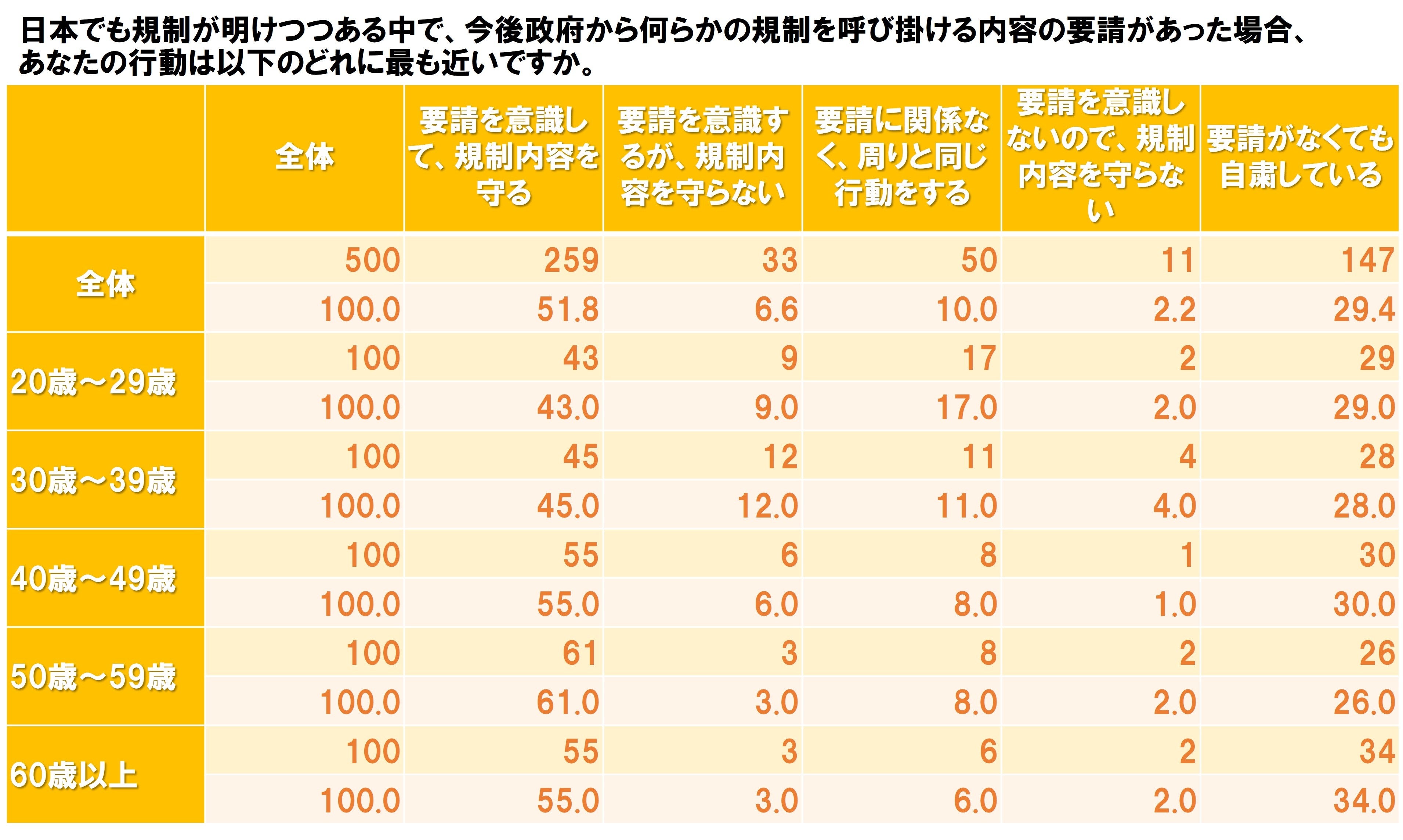 20代の男女に関して、規制を無視しがちというイメージを抱いている人もいるように思われますが、実際には“5割以上が規制を守り、3割近くが現在も自粛を行っている”という結果になりました。その中でも“周囲と同様の行動を取る”と回答した割合が17%と最も多く、他の年代に比べて他者の行動が本人の行動に影響しやすいことが見受けられる結果となりました。