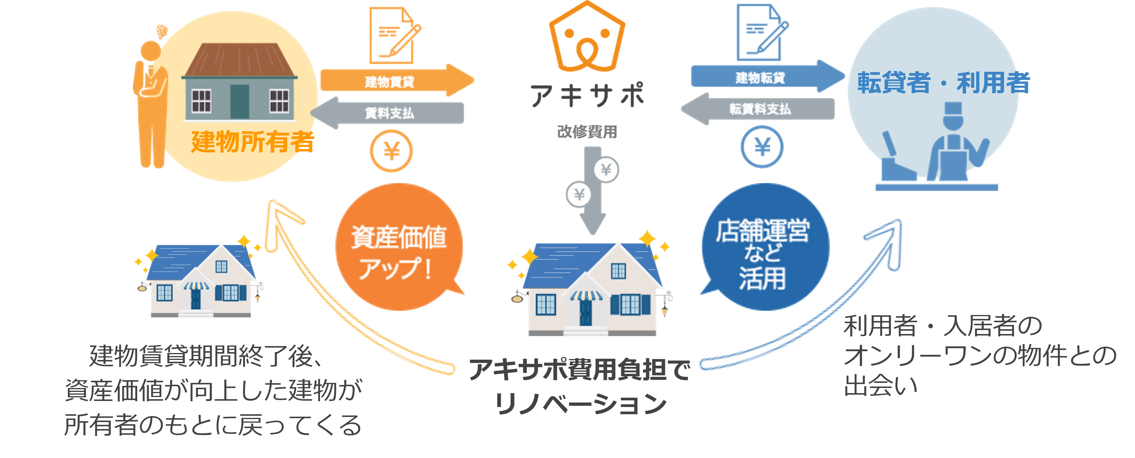 空き家を「アキサポ」が借り受け、「アキサポ」全額費用負担でリノベーション工事を行い、定期間転借するサービスです。地域にマッチした空き家活用を提案することで街の資源である空き家の再生を通じて地域コミュニティの活性化に貢献しております。