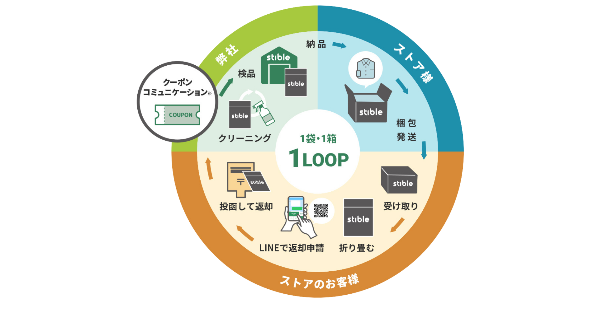 従来のダンボールを使用した場合「リサイクル/破棄」で止まってしまうため、お客様とのコミュニケーションは発生しずらいかと思います。しかしstibleサービスが展開されることで[ストア様・お客様・stible]にて「クーポンコミュニケーション/ポイントコミュニケーション」が発生します。すなわちコミュニティーが自然と生まれていくと考えております。